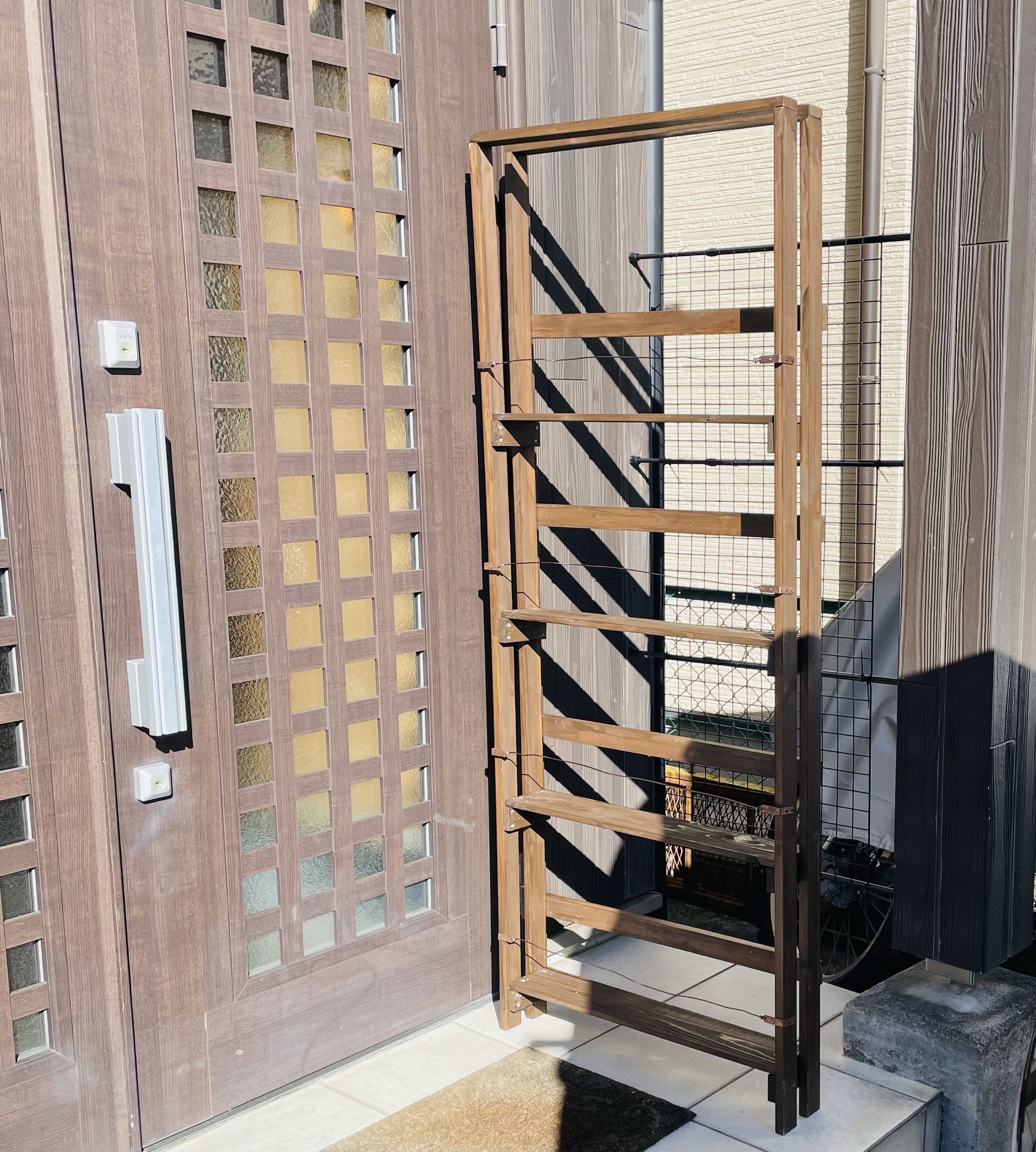 鉢が棚から後方に転落するのを防ぐためには、柱と壁の間につっぱりポールとワイヤーラティスを設置