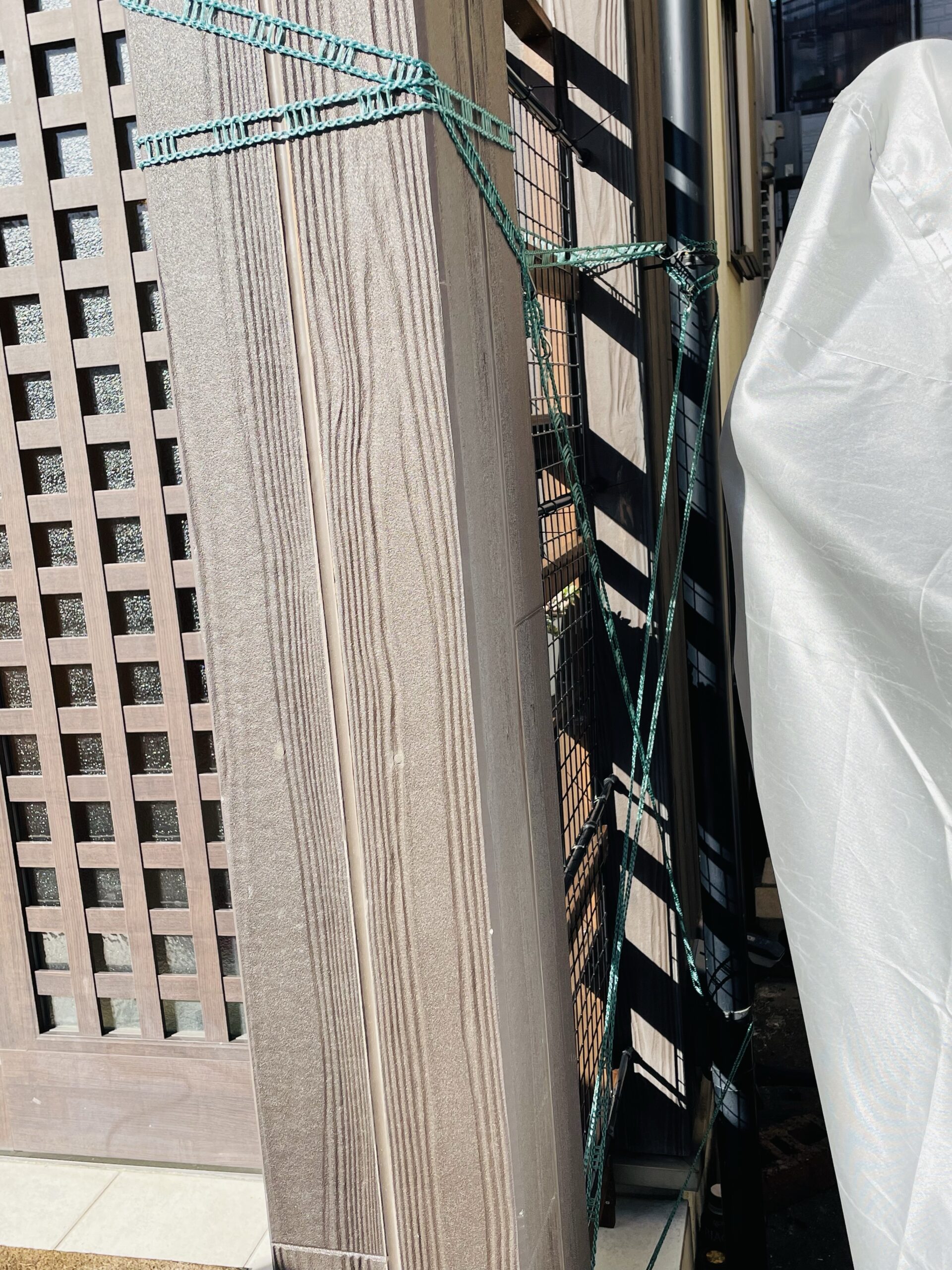 セリアで購入したキャンプ用のハンガーロープを柱と雨樋の間に斜めに渡してカラビナで固定