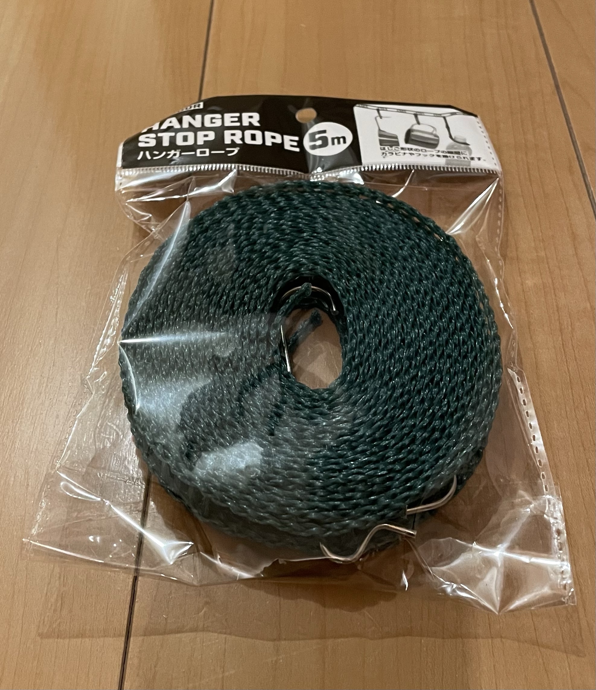 セリアで購入したキャンプ用のハンガーロープを柱と雨樋の間に斜めに渡してカラビナで固定