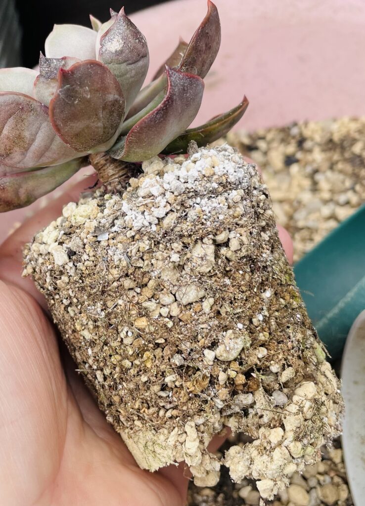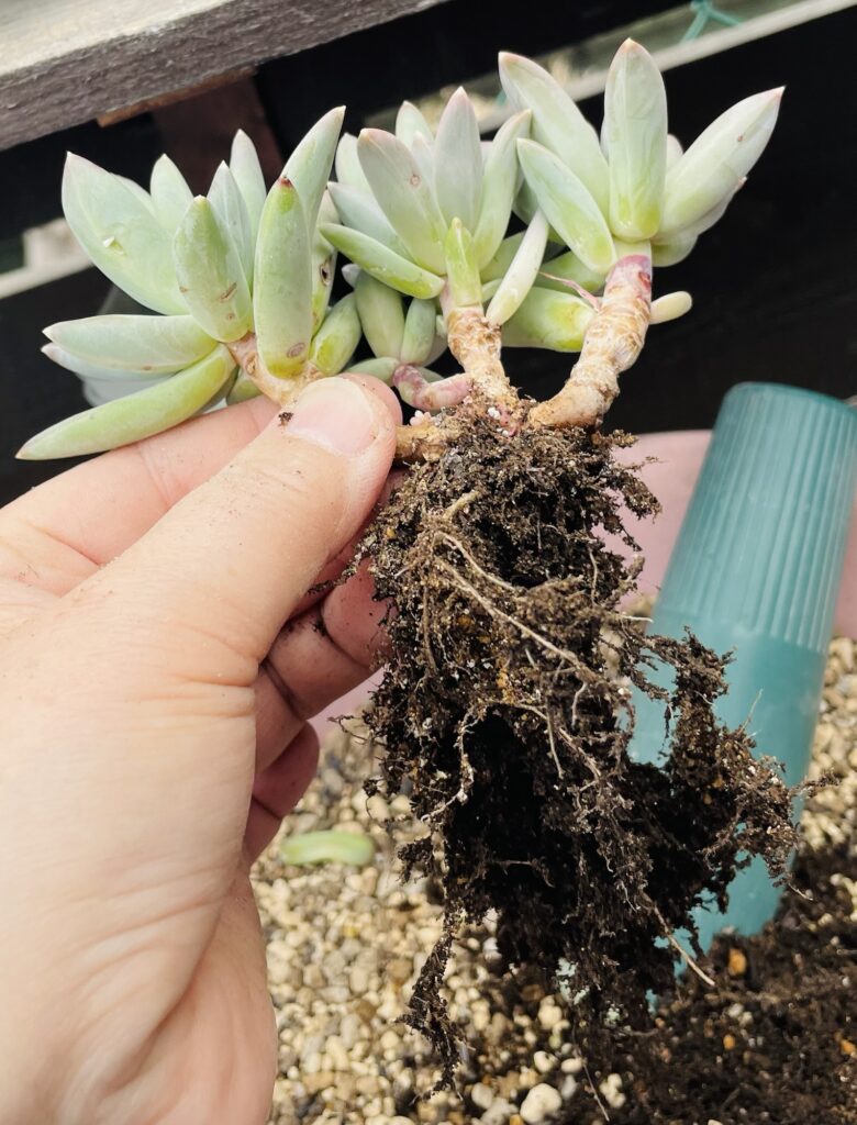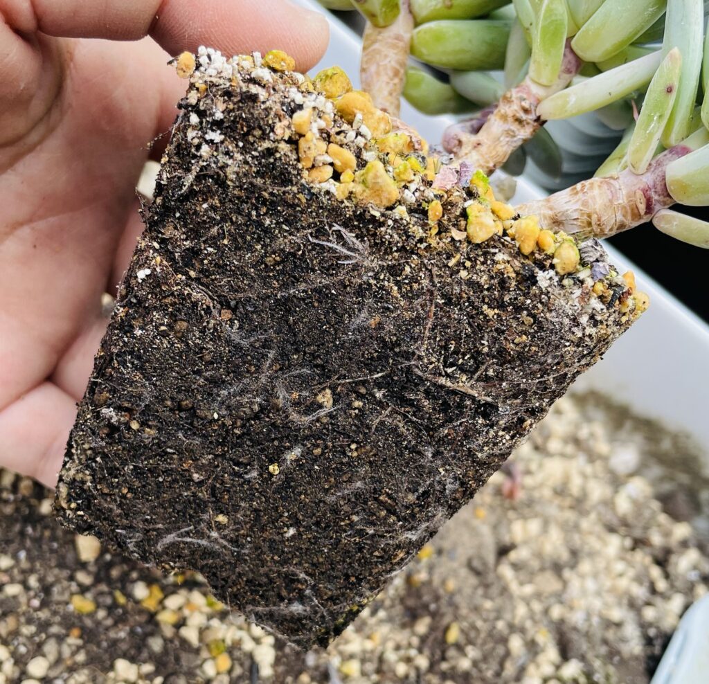 抜いてみると、根鉢はしっかり張っており、新しい白い根も見えてます。