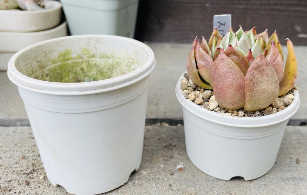 右のプレステラ75から左のスリット鉢2.5号にお引越ししました。