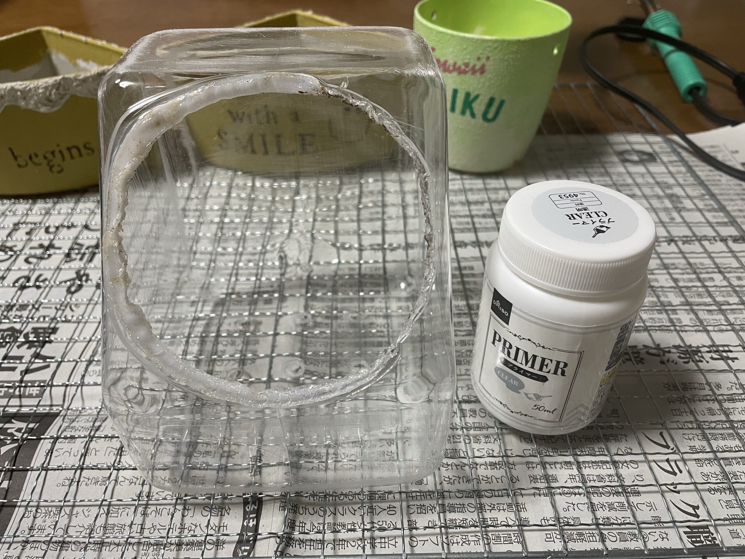 色付けの準備のために、紙やすりで傷をつけてから、DAISOのプライマーを塗りました。