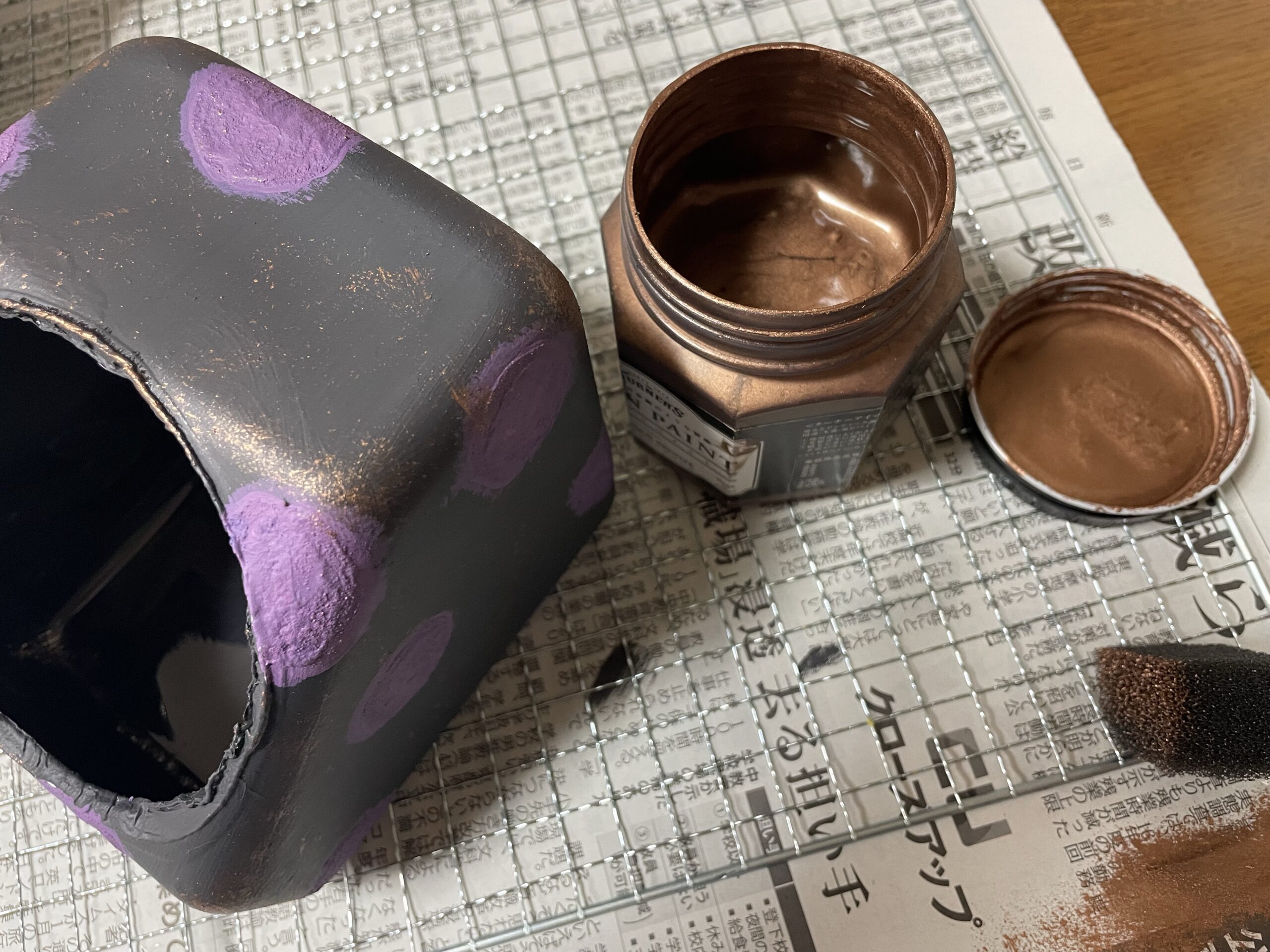 水玉部分はアクリル絵の具の赤と青を混ぜて好みの紫色🟣を作り着色。