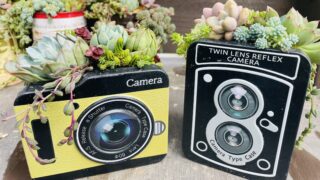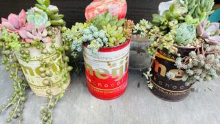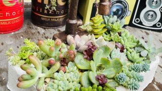 百均材料などを使った、多肉植物寄せ植え用の飾り棚のDIYを紹介しています。